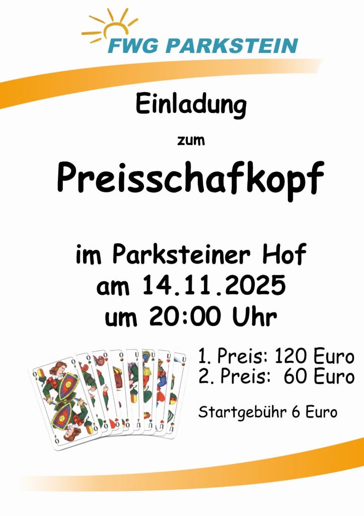 Der Preisschafkopf der FWG Parkstein findet am 14.11.2025 um 20:00 Uhr im Parksteiner Hof (Zetzl) statt.